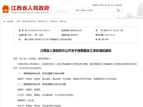 《江西省人民政府辦公廳關(guān)于調(diào)整最低工資標(biāo)準(zhǔn)通知》公布,從2024年4月1日 起執(zhí)行,調(diào)整后的江西省最低工資標(biāo)準(zhǔn)及其適用區(qū)域,一起來看看吧!江西省人民政府辦公廳關(guān)于調(diào)整最低工資標(biāo)準(zhǔn)的通知各市、縣(區(qū))人民政府,省政府各部門READ MORE...